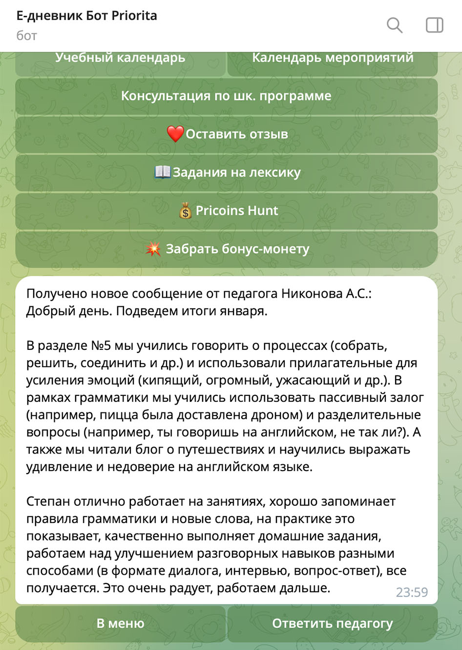Это пример комментария по успеваемости, которые наши педагоги ежемесячно отправляют клиентам через бота.