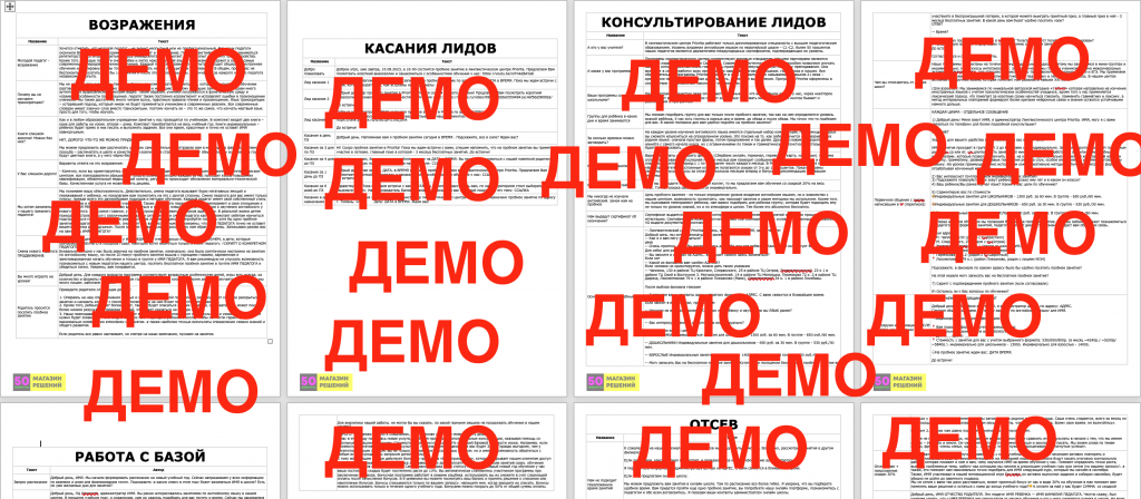 Набор основных скриптов для администраторов: работа с возражениями (недовольны ценой, результатами, вопросы по школьной программе и др.), касания и прогрев лидов до и после пробного занятий, скрипты для обзвона базы, скрипты по работе с отсевом, удержанию клиентов и др. В наборе только работающие скрипты, которые активно используются в Priorita и приносят результаты.