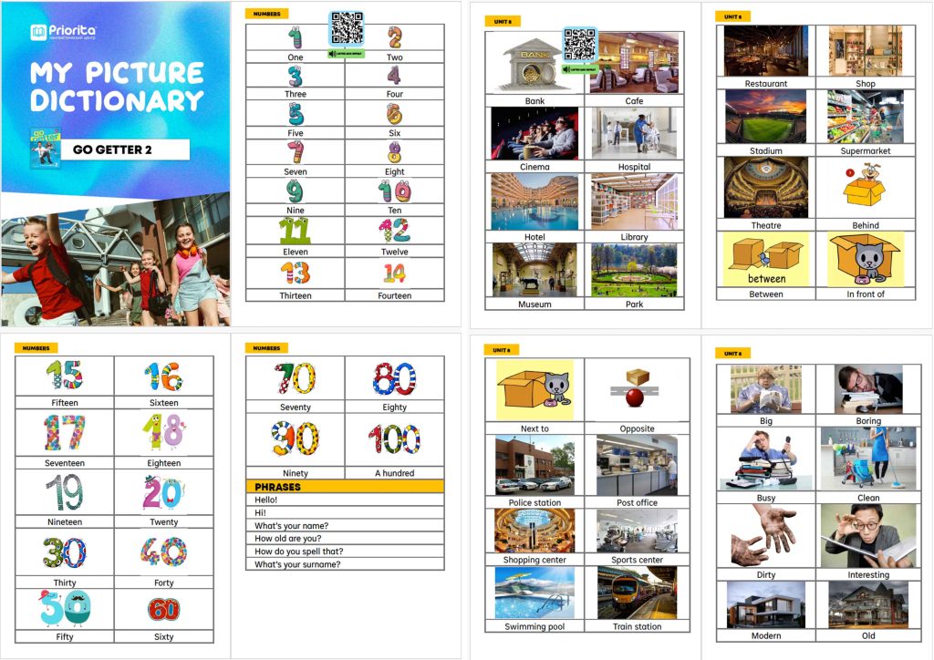 Уникальные словари с картинками и qr-кодами, которые ученики могут отсканировать и повторить слова за диктором. Данные словари очень помогают в изучении слов дома, систематизации лексики, а также визуально подходят для детей с дизлексией, что значительно повышает их успеваемость. В Priorita словари используются уже более 2-х учебных лет и являются сильным конкурентным преимуществом, а также сказываются на улучшении результатов учеников. Мы заказываем словари в типографии в виде брошюры формата А6 на скобах и включаем словари в стоимость комплекта учебников.